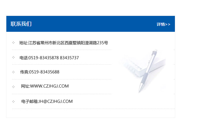 地址:常州市新北區友邦商務大廈1幢16、17層  電話:0519-85101652  傳真:0519-85112595  郵編:213022  網址:www_cz-jiayue_cn.cqxydq.com  郵箱:xiajifengaa@163.com